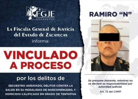 ZACATECAS.– La Vicefiscalía Distrital de Fresnillo, en coordinación con la Fiscalía Especializada en Delitos de Alto Impacto, consiguió la vinculación a proceso de Ramiro “N”, señalado por secuestro agravado, homicidio calificado en grado de tentativa y delitos contra la salud en modalidad de narcomenudeo con fines de comercio, en perjuicio de la sociedad.