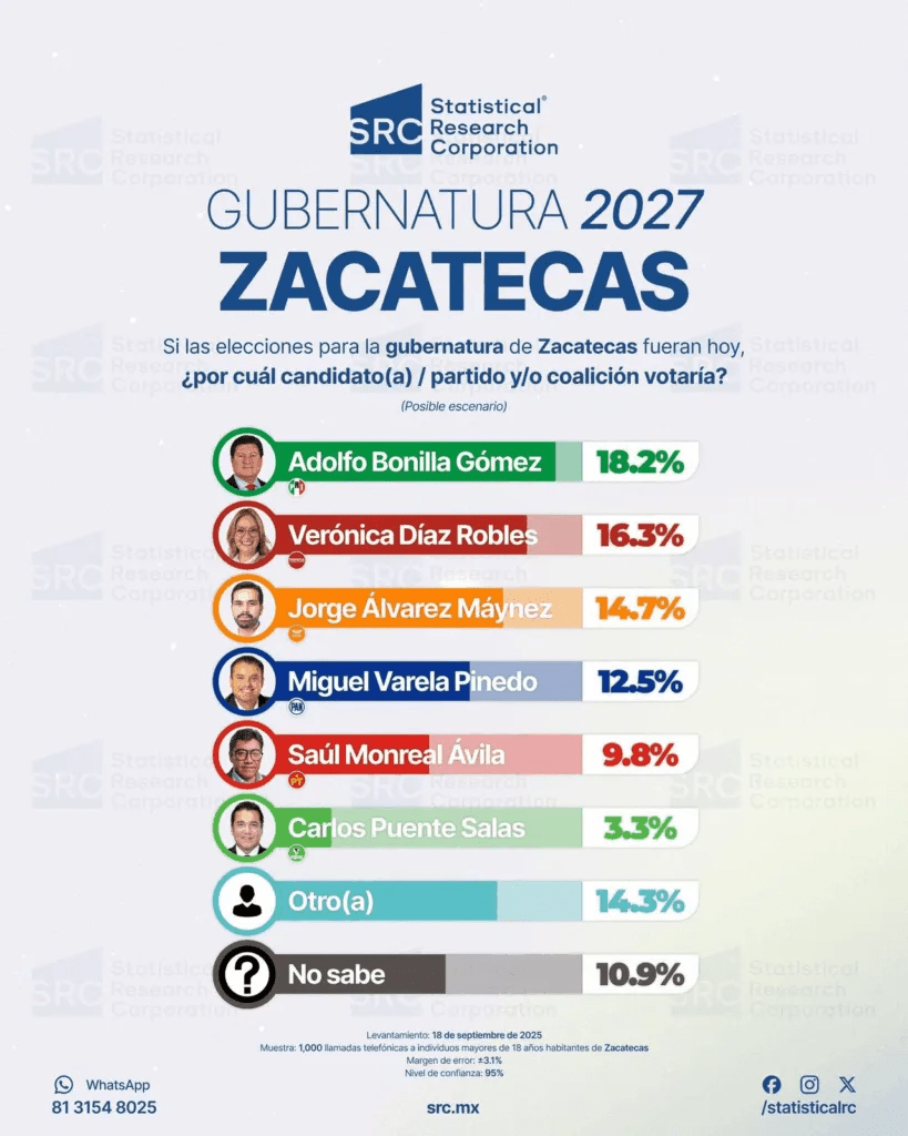 Las primeras encuestas muestran a Morena con 30% de intención de voto, seguido por PRI 17%, PAN 15%, MC 14%, PVEM 3% y PT 2%. Sin embargo, la fragmentación interna y los candados legales podrían abrir oportunidades para la oposición y convertir a Zacatecas en la gubernatura más complicada de Morena para 2027.
